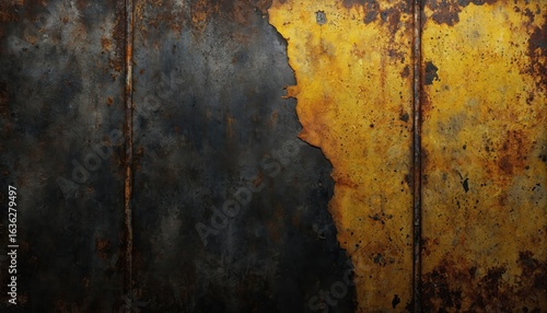 Rusty metal texture background. Grunge, dark, worn surface with oxidized, weathered, corroded, aged, scratched, damaged elements. Industrial steel plate with rust, yellow paint peeling off. Suitable