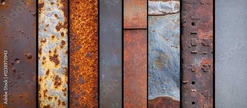 Rusty metal texture panel collection with various colors and patterns on weathered surfaces Copy Space