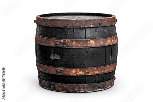 Rusty paint peeling off a weathered wooden barrel in a rustic setting.