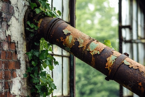 Rusty pipe with peeling paint and ivy growing on a weathered brick wall.