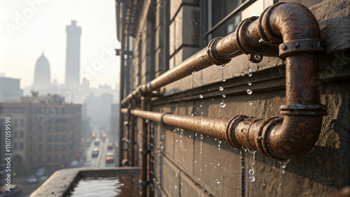 Rusty pipes with water droplets on building, city skyline in background, showcasing urban decay and pollution