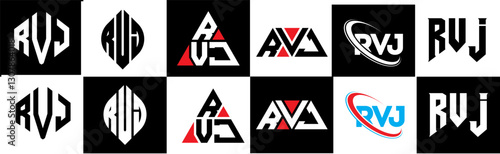 RVJ letter logo design in six style. RVJ polygon, circle, triangle, hexagon, flat and simple style with black and white color variation letter logo set in one artboard. RVJ minimalist and classic logo