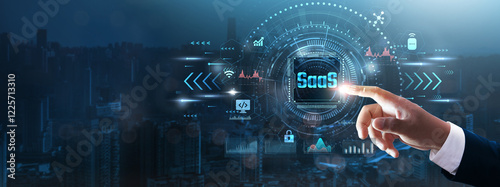 SaaS: Businessman’s hand touching futuristic technological interface, cloud solutions, software accessibility, scalability, and business efficiency in technology concept.