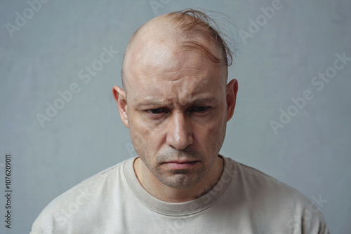 Sad bald man. The man's last hair is falling out.