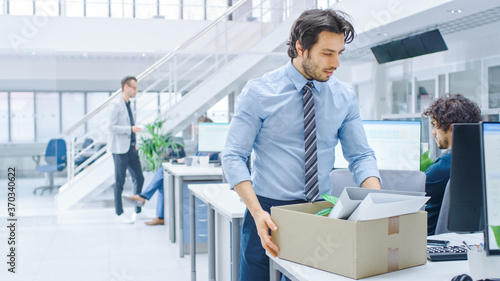 Sad Fired / Let Go Office Worker Packs His Belongings into Cardboard Box and Leaves Office. Workforce Reduction, Downsizing, Reorganization, Restructuring, Outsourcing. Mass Unemployment Market Crisis