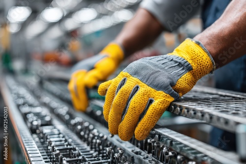 Safety gloves in use on an assembly line during production tasks Generative AI
