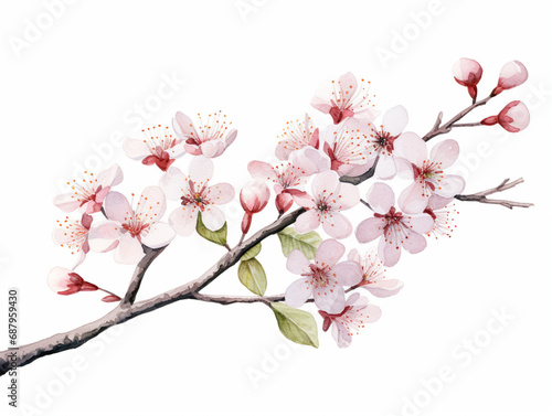 Sakura Branch in Bloom with Green Leaves. Illustration of Blooming Sakura Cherry Flower Branch with Leaf Isolated on White.