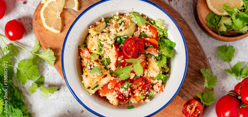 Salad of couscous and grilled vegetables in the bowl, cilantro, lemon and tomatoes on a gray concrete background top view. Vegan food. Arab or Middle Eastern cuisine.