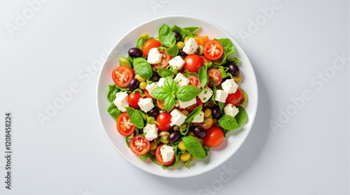 Salad with fresh vegetables, olives and cheese on the white background