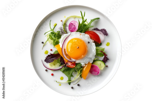 Salad with fried egg, fresh greens and vegetables isolated on white transparent background, top view. Concept of healthy breakfast or brunch meal