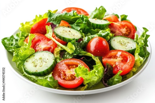 Salad with tomatoes and cucumbers, white background. AI generated illustration.