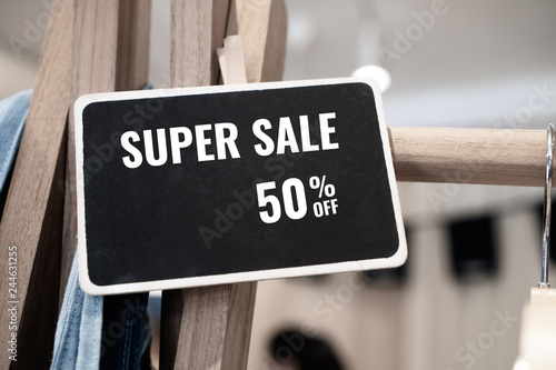 Sale 50% off Mock up wood black advertise display frame setting on clothes line at shopping department store fashion for shop, Business advertisement for custormer concept. Vintage tone