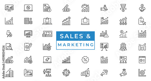 Sales And Marketing line icon set. Includes business, marketing, strategy, management, customer, analysis, sales, growth, concept, technology vector icon collection set