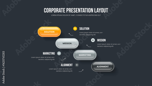 Sales Planning Four Element Infographic Presentation Template. Investor Strategy 4 Step Diagram Slide Design. Business Portfolio Frame Layout Vector Illustration.