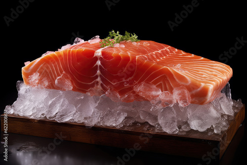 Salmon steaks on ice, fillet of red fish on black background, AI Generated