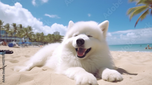 Samoyed Husky dog on the beach, Hawaiian style, Summer beach and recreation, beach background, Relaxing on the beach, Dogs on vacation, AI generated