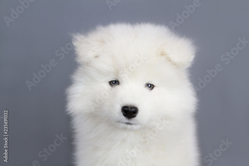 Samoyed puppy posing in the studio grey background. Show puppy.