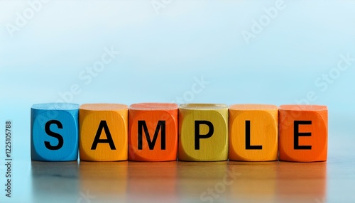見本や試供品サンプルを意味する英語のフレーズSAMPLEの文字が書かれた木製のキューブブロック。 aiで生成
