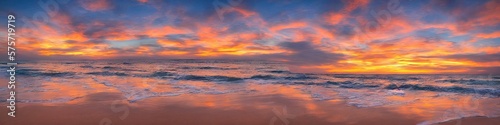 Sandy deserted beach with ocean waves on the shore. Skies and water meet on the horizon by generative AI