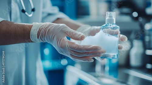 Sanitizing Hands: Doctor's hands being sanitized with a pump bottle of hand sanitizer, with foam and rubbing motion.