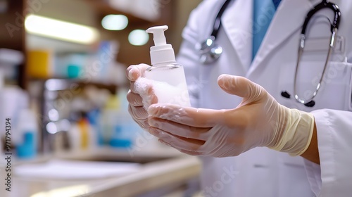 Sanitizing Hands: Doctor's hands being sanitized with a pump bottle of hand sanitizer, with foam and rubbing motion.