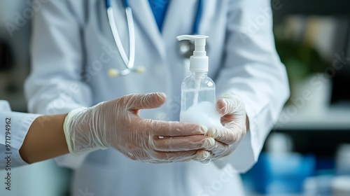 Sanitizing Hands: Doctor's hands being sanitized with a pump bottle of hand sanitizer, with foam and rubbing motion.