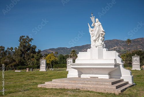 Santa Barbara, California, USA - February 8, 2022: Calvary Cemetery. Landscape with central white main statue of Jesus the savior and punisher on green burial lawn under blue sky. Santa Ynez mountains