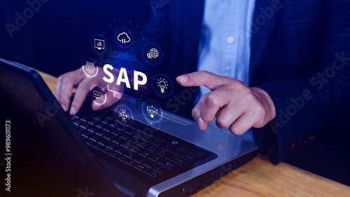 SAP system concept, SAP System Application Products, Business process automation and management software concept, management solutions.