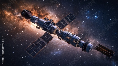 Satellite in deep space exploration orbiting earth with solar panels and a bright nebula view background silhouette