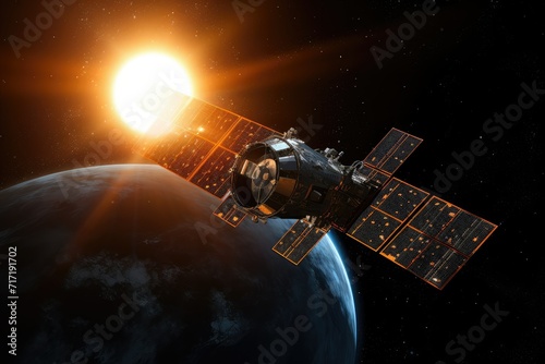 Satellite in space. 3D render. planet earth and sun view from satellite. the satellite in space with earth and sun background. space exploration.