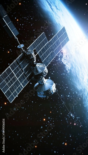 Satellite Orbiting Earth with Communication Arrays Highlighting Innovations in Global Exploration