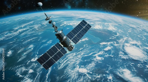 Satellite orbiting Earth with solar panels and global network