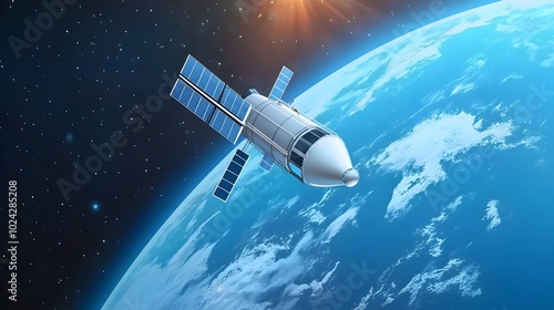 Satellite Orbiting the Earth in Flat Design for Space Research and Technology and Science Concept with Global Communication and Data Transmission