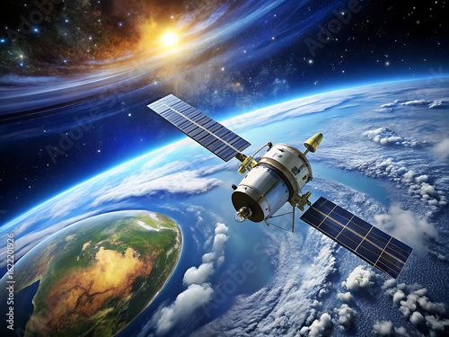 Satellite orbiting the earth in space with sun rising over the horizon