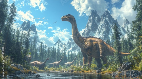 Sauropods by mountain stream in prehistoric landscape.