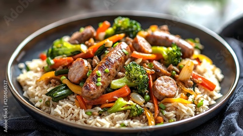 Sausage and Vegetable Stir-Fry on Jasmine Rice,Modern and Flavorful Culinary Dish