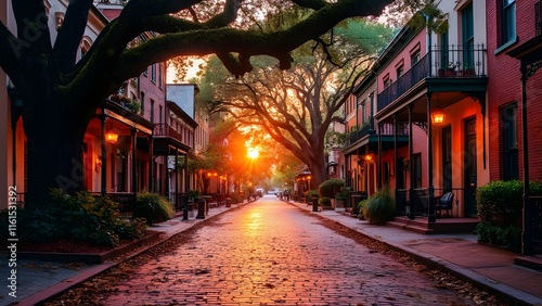 Savannah Sunset, Cobblestone Street, Antebellum Architecture, Majestic Oaks