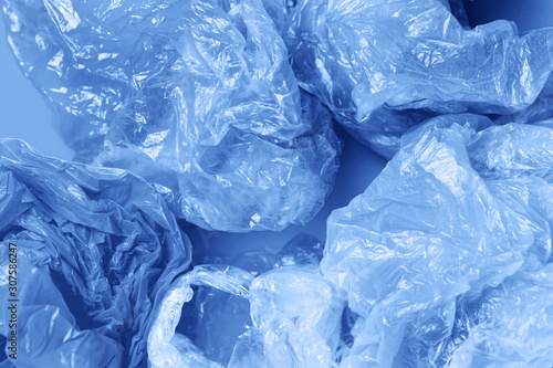 Save the planet concept: plastic trash, plastic bags and garbage. Environment pollution concept. Classic blue color of 2020.. Flat lay. top view