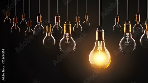 Saving electricity and power outage, electricity problem. One light bulb is on and many light bulbs are not on, on a black background.