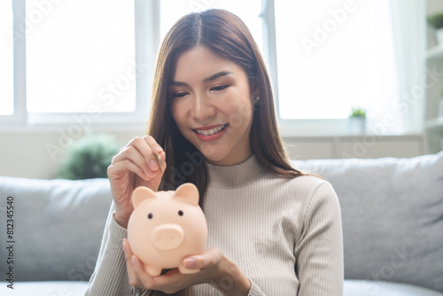 Saving money wealth concept, asian young business woman hand putting coin into piggy for saving cost, cash finance planning to spend enough money on her income for save money, payment tax, investing.