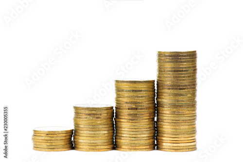 Savings, increasing columns of gold coins, piles of gold coins arranged as a graph on white background, business banking.