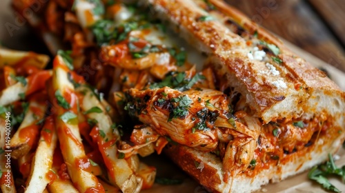 Savor a spicy chipotle chicken torta paired with crispy fries for the perfect meal blend of flavor and crunch.