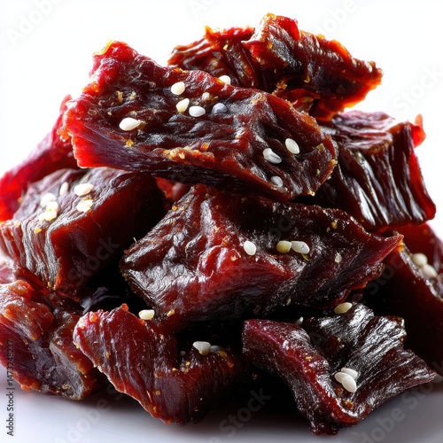 Savory and Delicious Dried Meat Snack with Sesame Seeds on a Bright White Background for Healthy Eating and Gourmet Treats