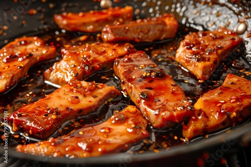Savory and Sizzling Pork Slices Marinated in Delectable Sauce and Cooked to Perfection in a Pan