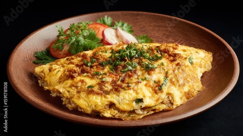 Savory Omelette Dish with Fresh Herbs and Tomato Slices on Rustic Plate
