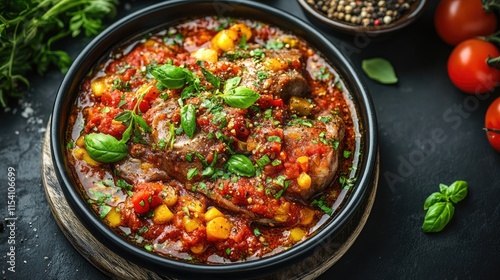 Savory Osso Buco with Veal Shank, Rich Tomato Sauce, Fresh Vegetables, and Herbs in an Elegant Black Bowl on Dark Background
