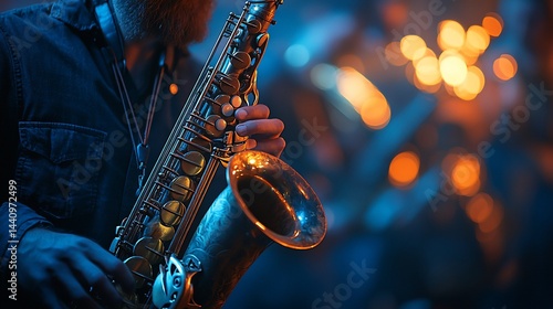 Saxophonist performing live on a vibrant, illuminated stage