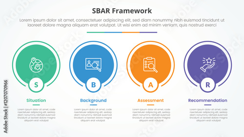 SBAR tool framework infographic concept for slide presentation with big circle outline on horizontal direction with 4 point list with flat style