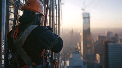 Scaffolder attaching safety rails to the edge of a building. Safety and precision