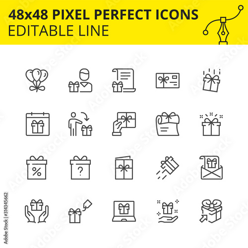 Scaled Icons of Gift and Surprise boxes. Includes Gift card, Air Balloons, Envelope, Postcard etc. Pixel Perfect Editable Set 48x48. Vector.